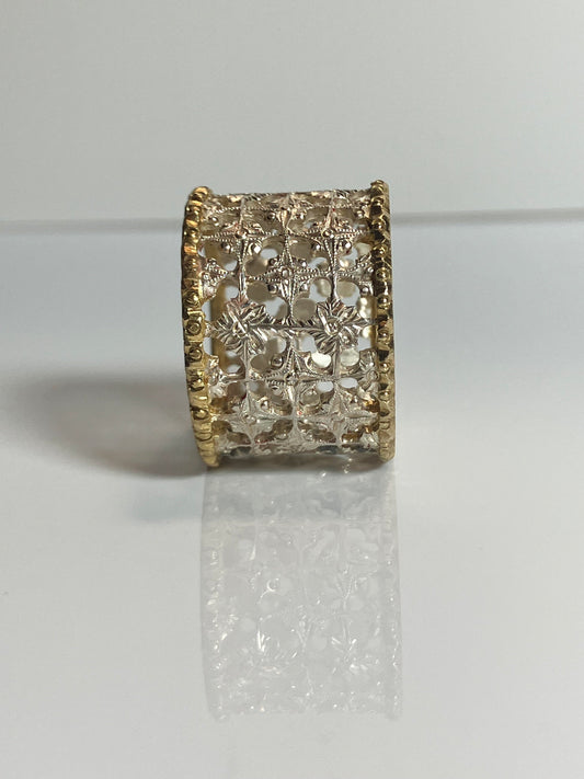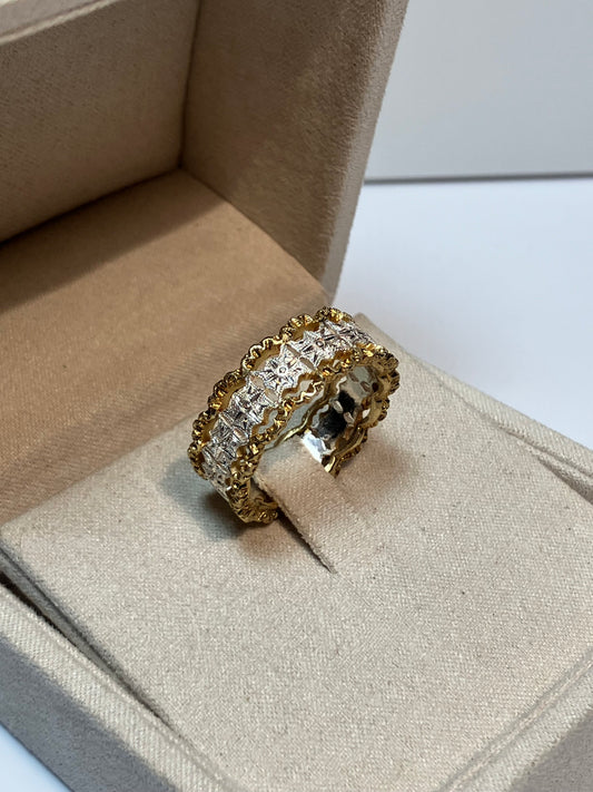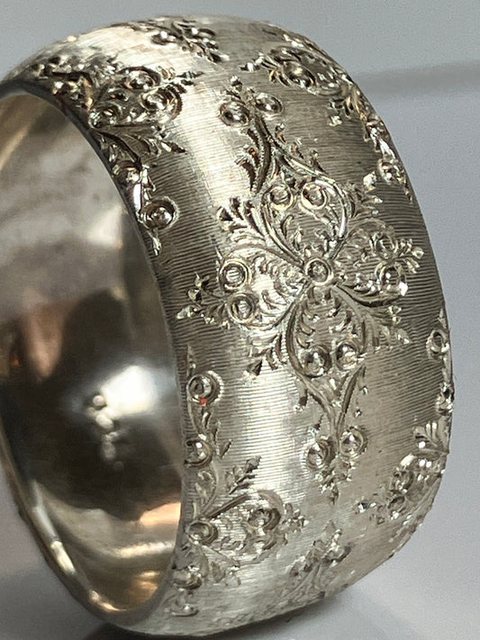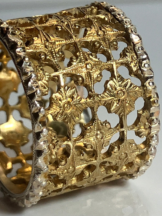 Каждый штрих выполнен скрупулезно ,гравировка придаёт металлу мягкость с эффектом шелка и кружева , пространство между полным и пустым невероятно важны ,а центральные камни оживляют мастерство и придают уникальности